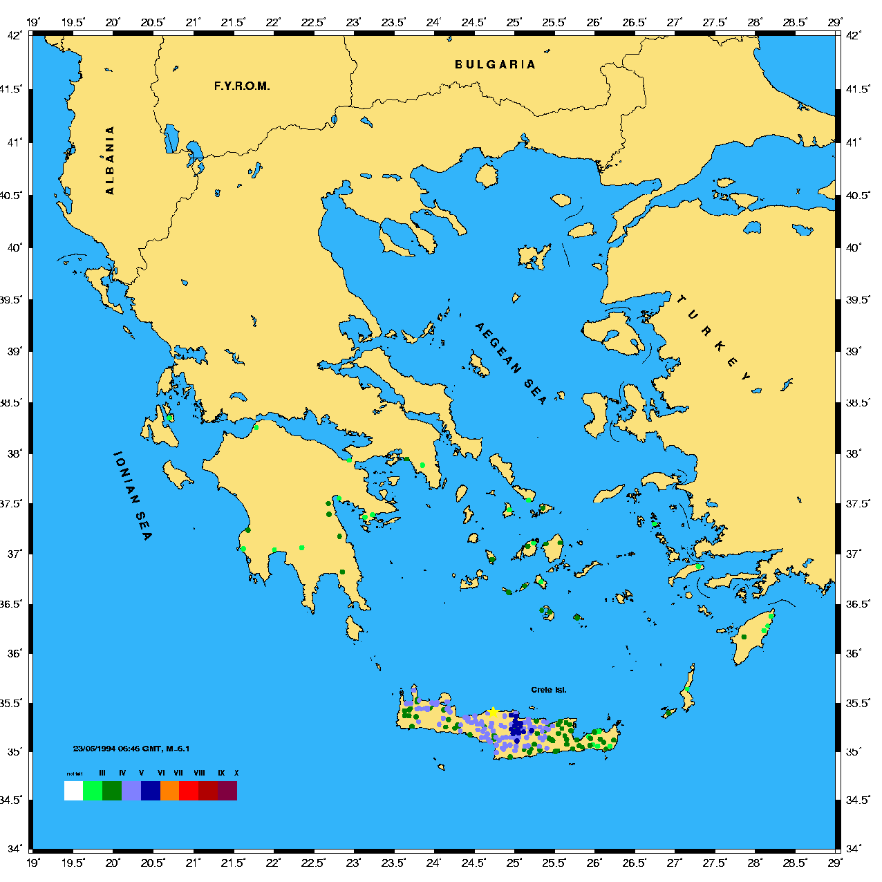 | 23 Μαΐου 1994 | 06:46 | 35.4 | 24.7 | 81 | 6.1 | VI στον Άγιο Μύρωνα Ηρακλείου | * | ||